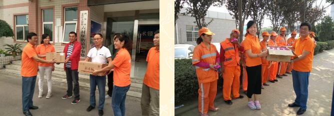 秋风送爽、丹桂飘香,在中秋佳节即将到来之际,2015年9月21日,中共陕西秦食业有限公司党支部为未央区六村堡街道办事处辖区的环卫工人送去了月饼和中秋的祝福,表达了对环卫工人的崇敬和关爱之情。